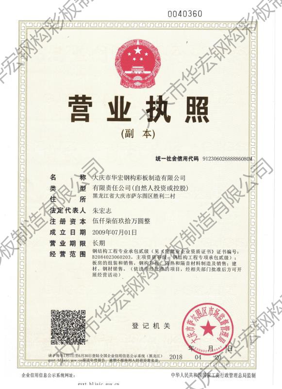 華宏鋼構始建于2009年8月9日,總部位于大慶市薩爾圖區(qū)南一路13號,現有大慶市華宏鋼構彩板制造有限公司、黑龍江省華宏力安綠建科技有限公司、大慶市華宏鋼構彩板制造有限公司長春分公司、黑龍江省海森新材料科技有限公司、大慶市瑞和通螺栓廠五家工業(yè)企業(yè)形成了以彩板復合板、裝配式鋼結構建筑、保溫材料、配件制造為主的五大生產基地,占地總面積 20余萬平方米,生產車間5萬平方米。中高層管理干部26 人,高級工程師9人,各類國家注冊執(zhí)業(yè)人員 32 人,車間技工 260人,專業(yè)安裝隊伍 10 余支,帶動就業(yè) 500